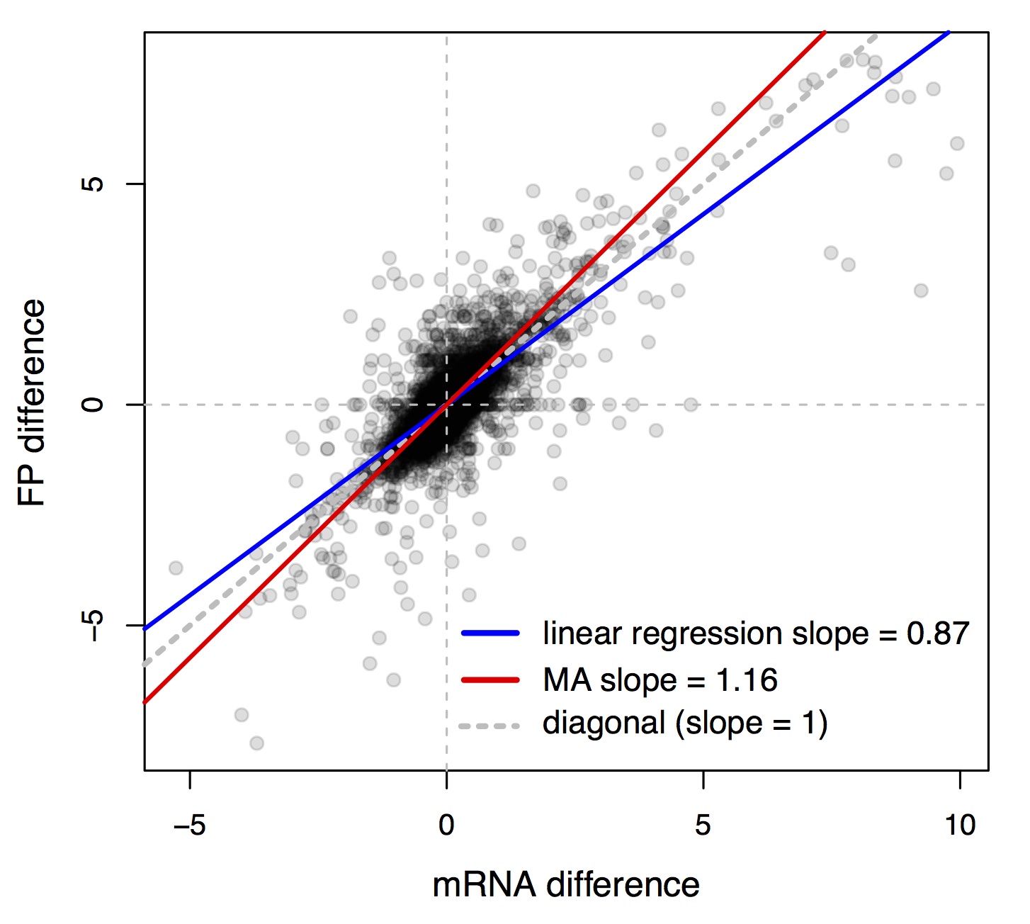 In the figure, differences are plotted as log2-transformed fold changes so that zero indicates “no change”, and the resulting distributions of differences are more or less normally distributed. We see a seductively strong negative correlation between mRNA differences and TE differences. Taken at face value, this seems to suggest that mRNA differences are typically accompanied by a difference in TE that buffers the mRNA difference: more mRNA in one strain is counteracted by lower TE, presumably resulting in a protein difference that is smaller than the mRNA difference would predict.