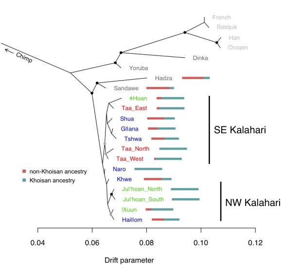 - Within the southern African Khoisan, there are two genetic groups, which correspond roughly to populations in the northwest and southeast Kalahari semi-desert. Populations from these two groups have been labeled in the tree in this post (see also Figure 1B in the preprint). We estimate that these two groups diverged within the last 30,000 years. However, this date should be taken as an upper bound due to point #2 below.